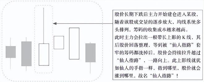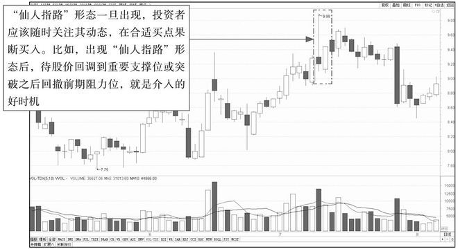 “仙人指路”形态是一根带有较长上影线的K线,但其位置主要出现在个股上升途中,是一种十分明显的上升中继信号,如图1-1所示。