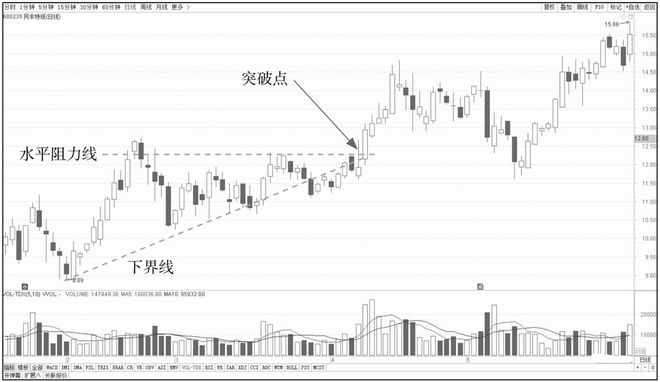 如图2-2所示为民丰特纸(600235)在1月至3月期间的走势图,此股在上升途中出现了一个“上升三角形”形态。“上升三角形”显示买卖双方在该范围内的较量,但买方的力量在争持中已稍占上风。大部分的“上升三角形”都在上升的过程中出现,且暗示有向上突破的倾向。在向上突破“上升三角形”顶部水平的上边线阻力时,并有成交量激增的配合,就是一个短期买入信号。另外,也可能是有计划的市场行为,部分人士有意把股价暂时压低,以达到逢低大量吸纳之目的。